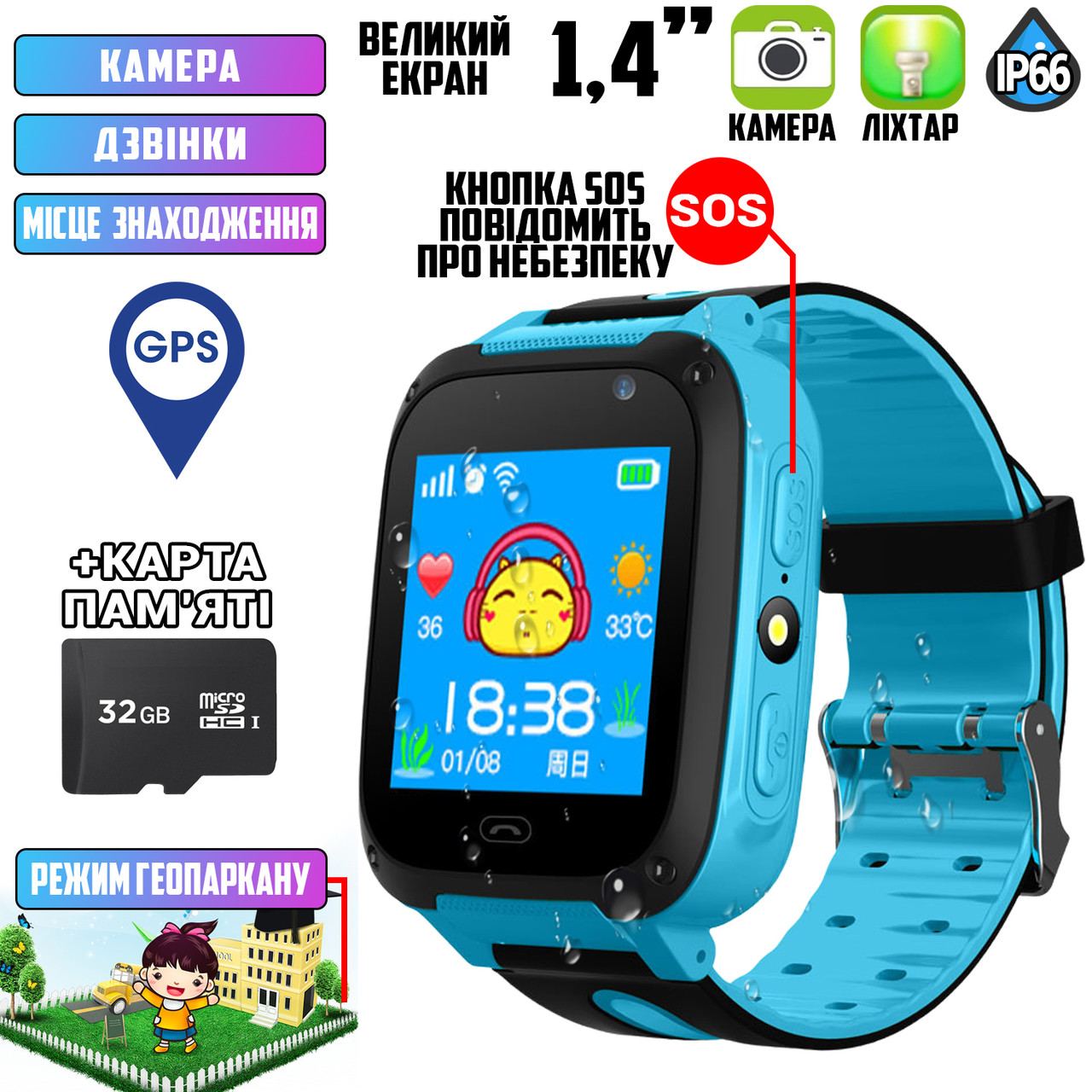Дитячі смарт годинник з GPS і SIM картою BW-F2, камера, SOS , ліхтарик, геозабор, Blue+Карта пам'яті 32Гб